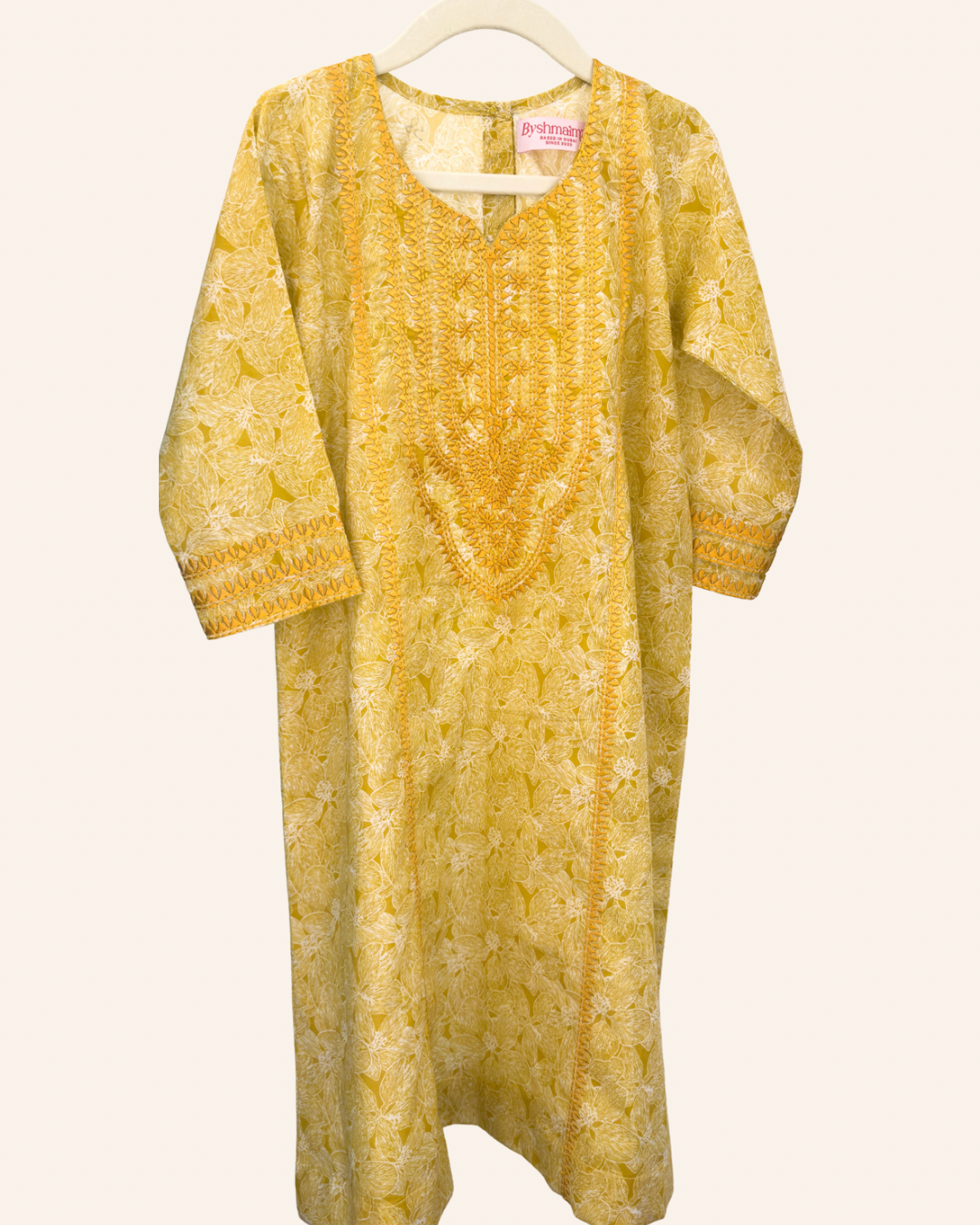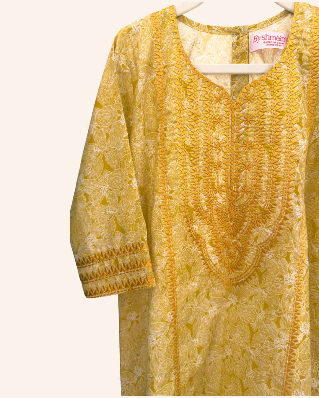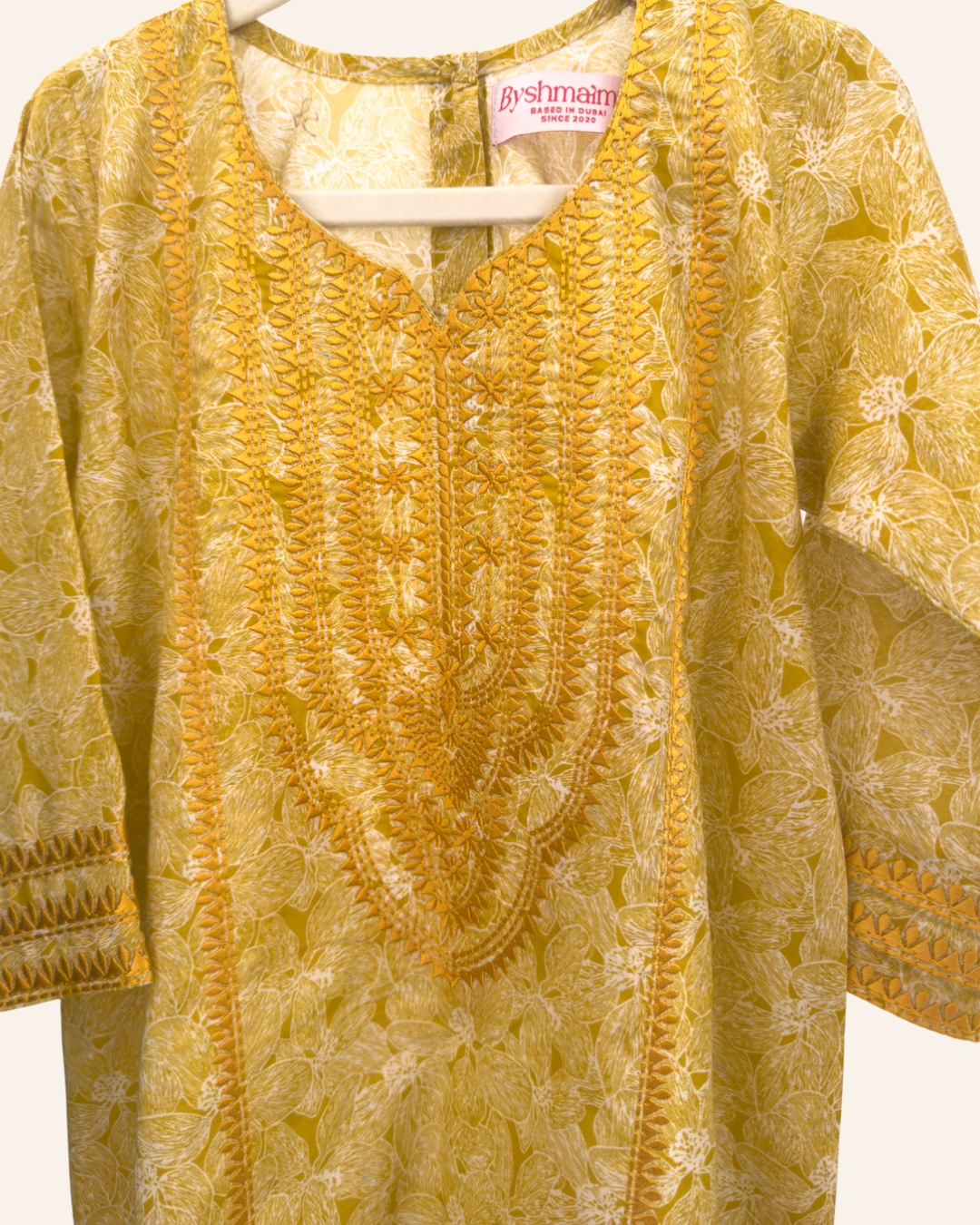 Yellow jalabiya made of Liberty cotton with fine embroidery.